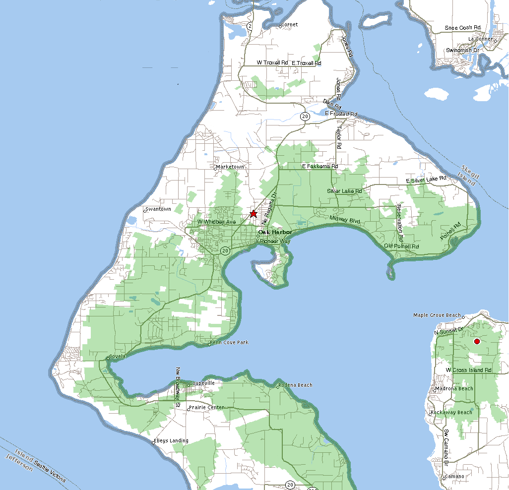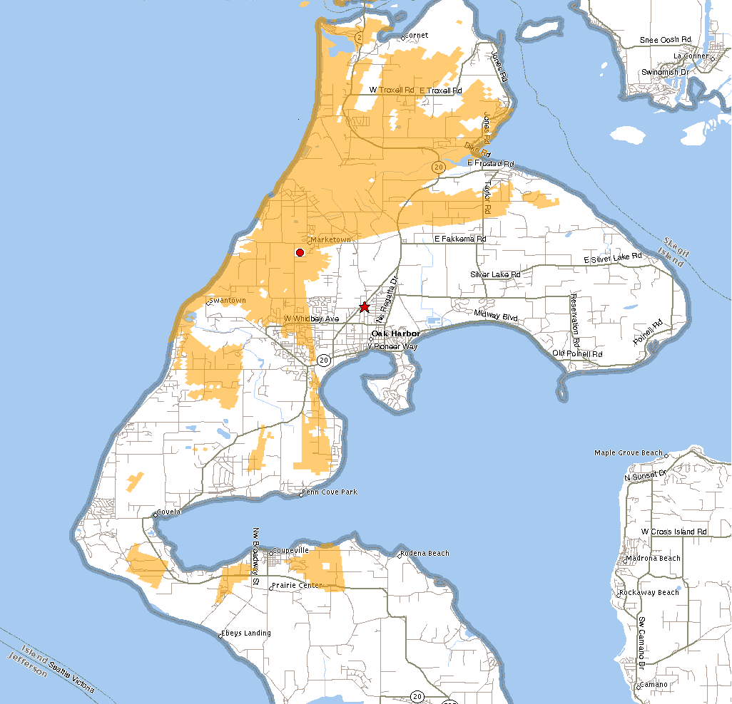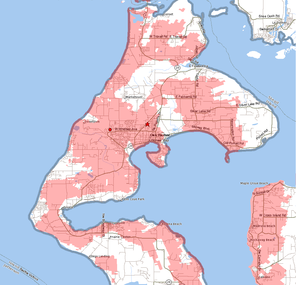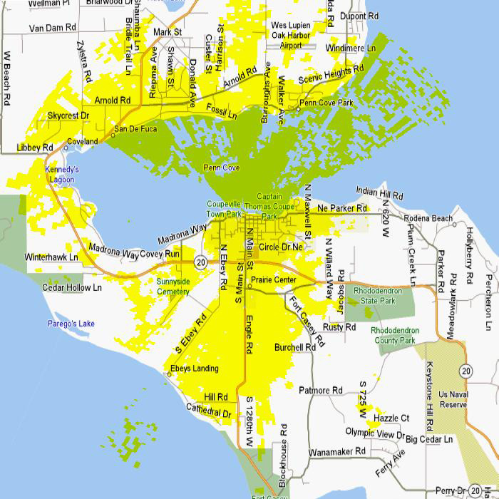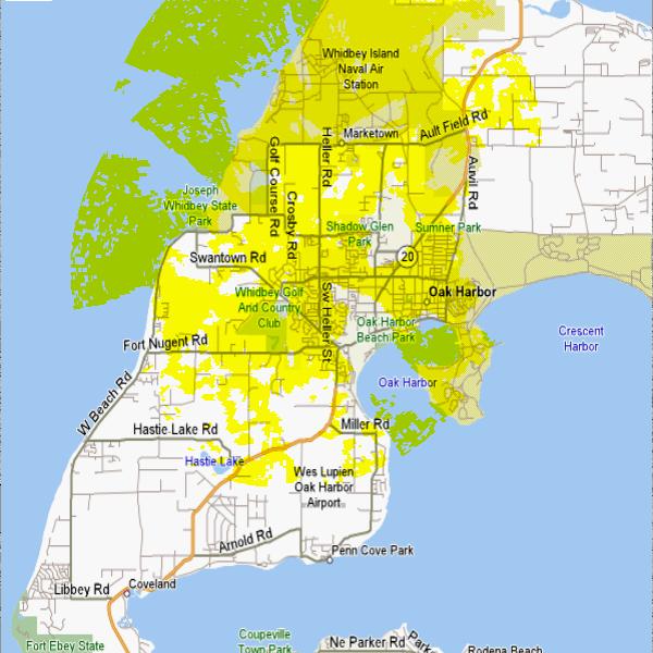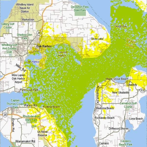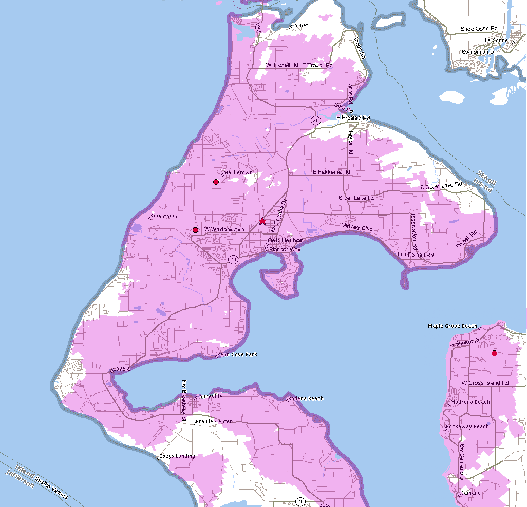 These are close approximation coverage maps for our Access Points (antennas) in Oak Harbor, Coupeville, Rolling Hills, North Whidbey and Camano Islands. Keep in mind Wireless Internet service is based on Line of Sight (LOS), so the actual service areas may be slightly different than shown due to the nature of Whidbey and Camano Islands with their hills, tall trees and buildings. The signal can reach farther -- up to 25 miles -- but 5 to 10 miles is the optimal range without having to erect large towers and use larger antenna systems.